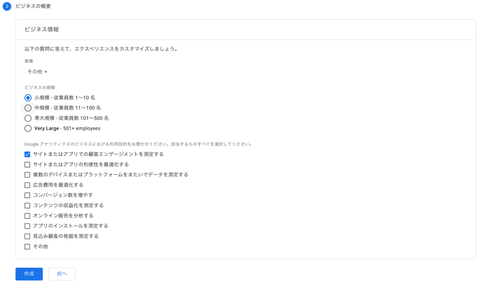 ビジネスの概要では、サイトの規模や目的を入力します。