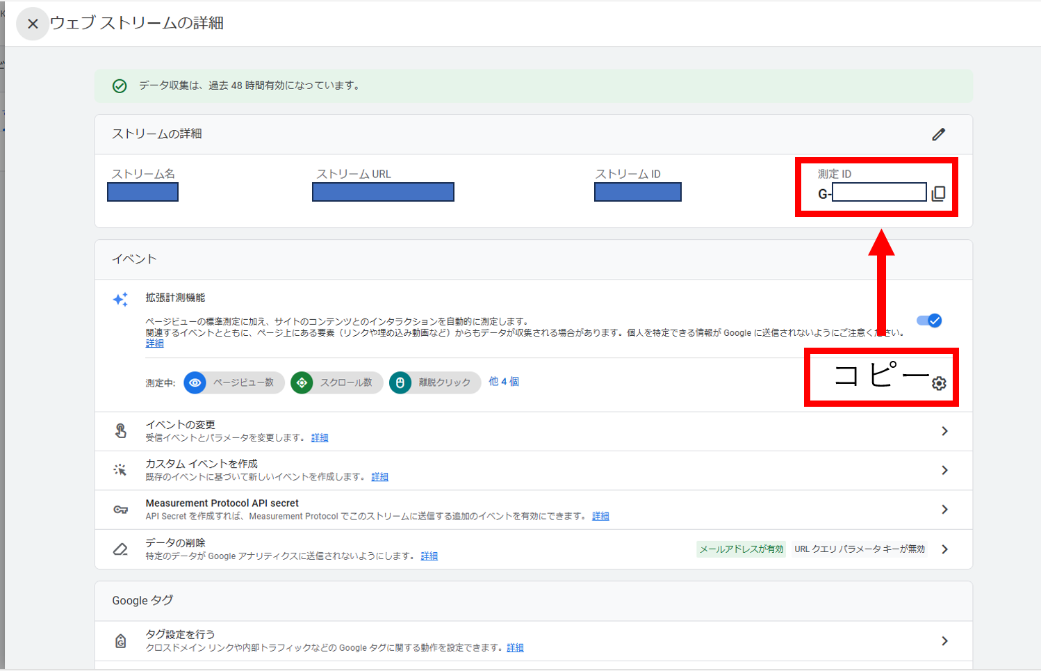 プロパティ作成後、測定ID(G-XXXXXXXXX)が発行されます。これをコピーしておきます。