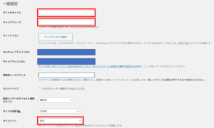 管理画面 → 設定 > 一般:①サイトタイトル、②キャッチフレーズ、③タイムゾーン(東京)を設定する。