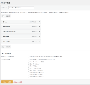 管理画面 → 外観 > メニュー :ヘッダーメニュー・フッターメニューを作成。